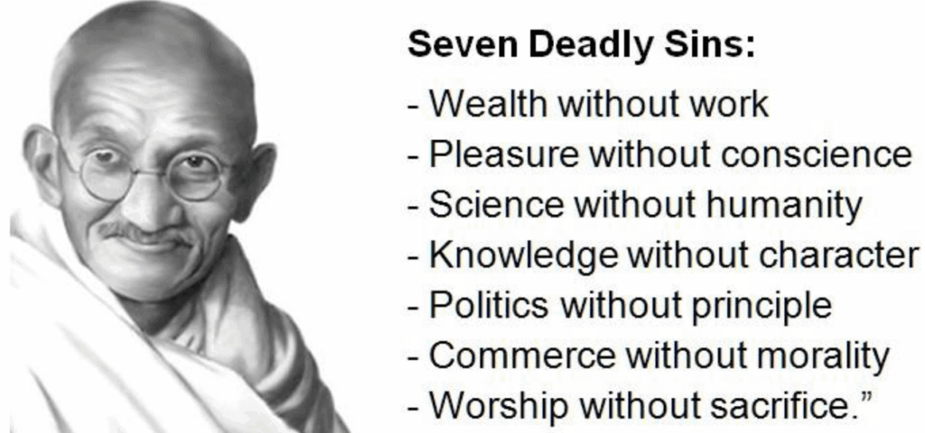 On October 22, 1925, Mohandas K. Gandhi published his “Seven Social Sins” in Young India. A century later, they’re still quoted—and still needed. For a contemporary angle on their roots, see our related essay: “When Right is Bad and Wrong is Good.”
