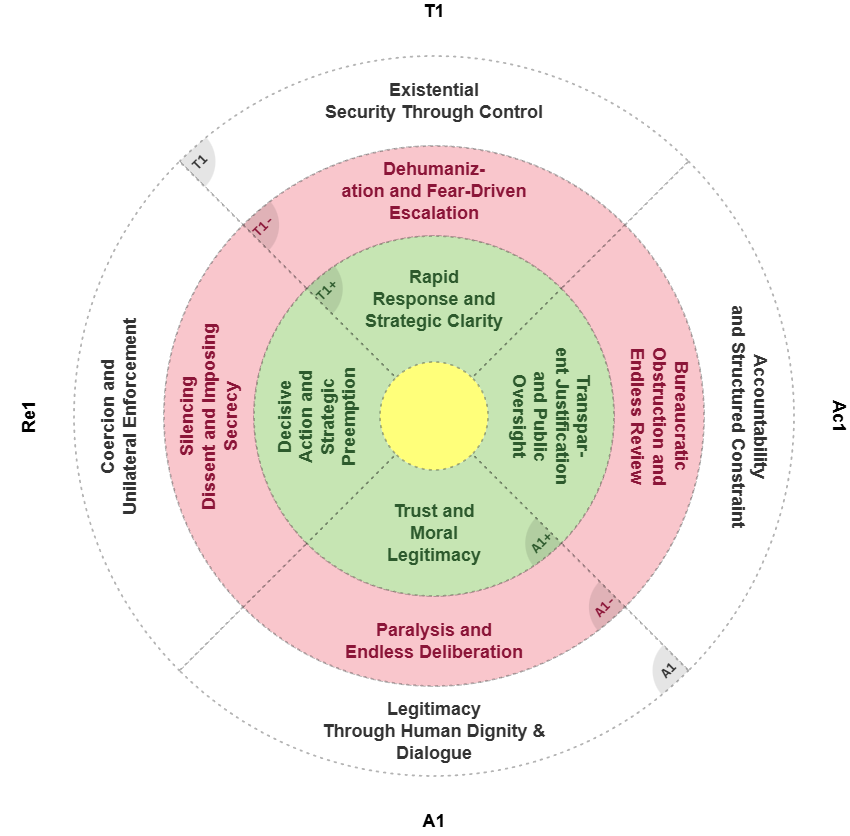 The attached dialectical wheel shows how this logic drifts toward dehumanization and fear-driven escalation (T1 — red zone). The missing counter-agent lies diagonally: Legitimacy Through Human Dignity and Dialogue (A1 — green zone).