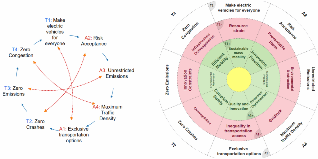 The first wheel suggests a likely sequence. In the near term we accept more risk (A2), see higher upstream emissions (A3), and experience greater traffic density (A4). These pressures tend to make mobility more exclusive (A1). Only after this might the system swing toward the intended theses—Zero Crashes (T2), Zero Emissions (T3), and Zero Congestion (T4)—and, last, the ambition of making EVs for everyone (T1).