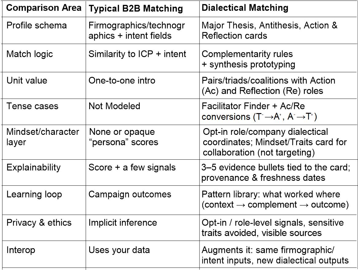 Most B2B platforms rank look-alikes against an Ideal Customer Profile (ICP) using firmographics, keywords, and short-term intent. We suggest a structured dialectics layer that models long-term complementarity (who makes whom better), conflict handling, and coalition or dream-team making.