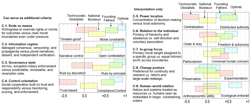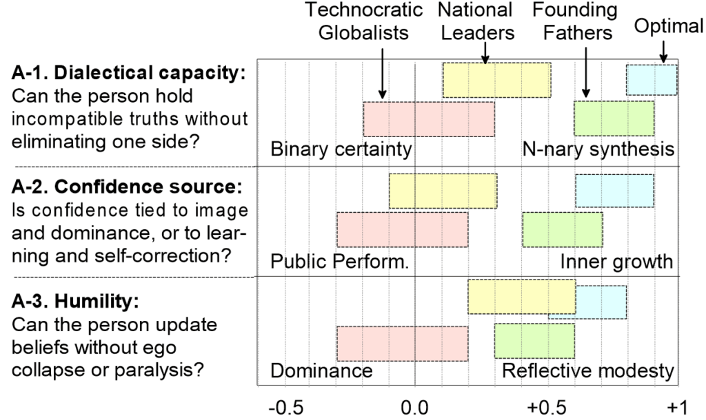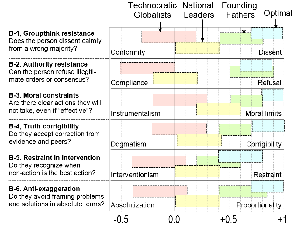 (Here and below, numeric scores are illustrative GPT estimates. “Technocratic globalists” refers to WEF-style leadership; “National Leaders” to typical contemporary governments; “Founding Fathers” to the American signers of the Declaration of Independence.)