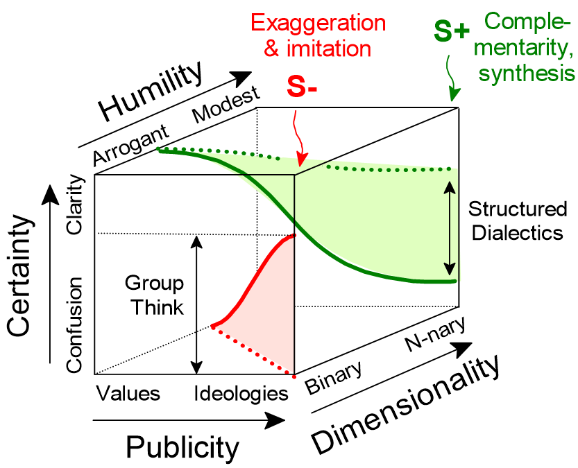 The red path (S−) shows what happens when leaders collapse complexity into binary thinking: exaggeration, imitation, and groupthink progressively reduce dimensionality. The green path (S+) shows positive synthesis: the capacity to hold opposing perspectives without eliminating either — maintaining clarity without domination.